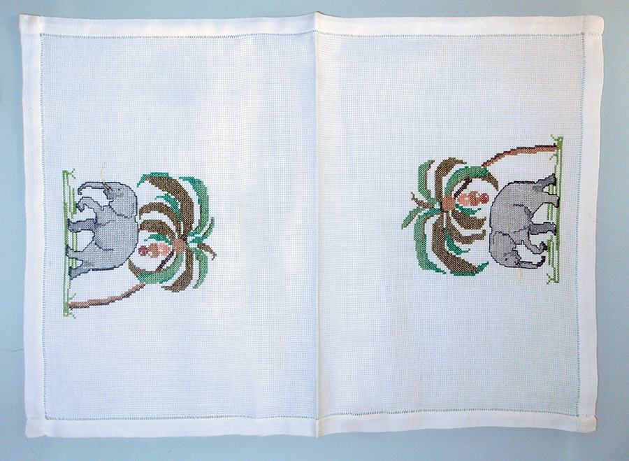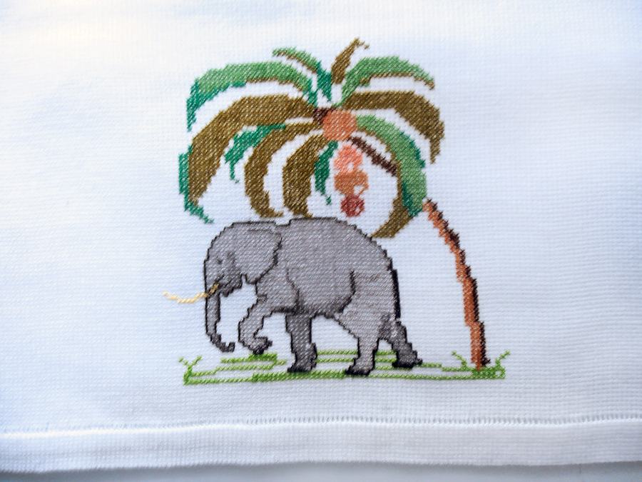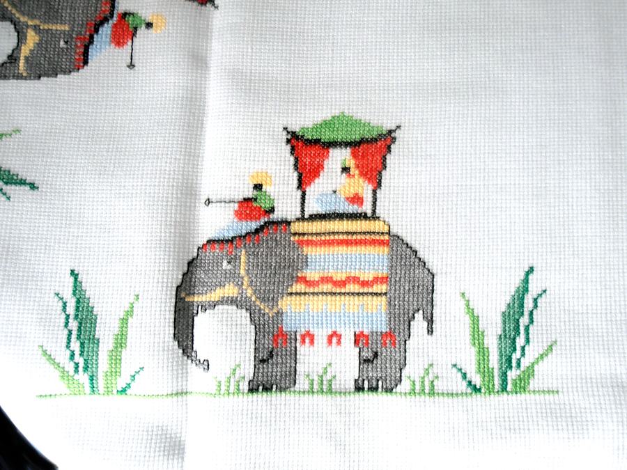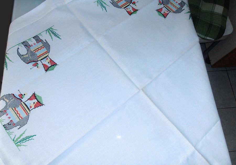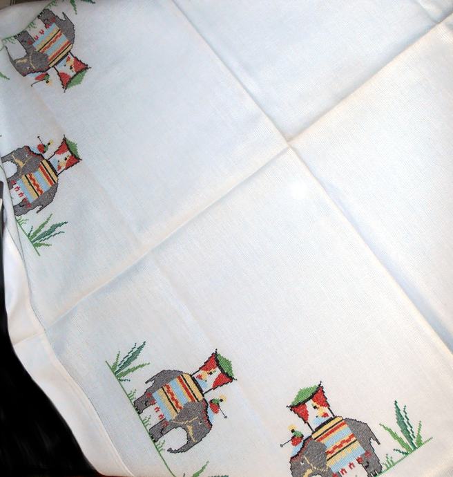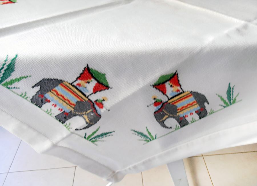 Ručno vezen stolnjak sa slonovima, donešen davno iz Indije. Nikad rabljen (84 x 84 cm) i tabletić sa vezenim slonićem 49 x 35 cm koji je rabljen ali bez oštećenja i očuvan.