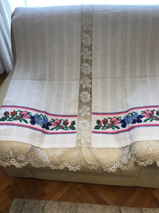 Prodaje se stolnjak domaće platno necana čipka slavonska. Dimenzije: 200 x 100 cm.