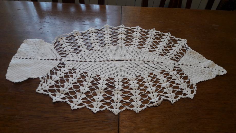 Prodajem heklani stolnjak u obliku ribe dimenzija 45 x 80 cm.