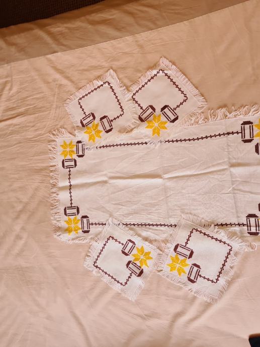 Stolnjak dimenzije 80x40 cm + 4 salvete dimenzije 20x23 cm.