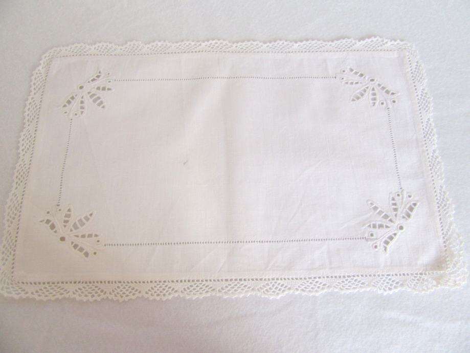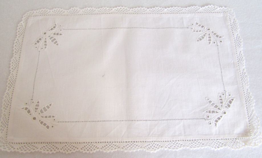 TRI ŠLINGANA TABLETIĆA,RUČNI RAD, BIJELI, OBRUBLJENI IZUZETNO FINOM,TANKIM KONCEM HEKLANOM ČIPKOM, SVA TRI ZAJEDNO 100 KN.DIMENZIJE TABLETIĆA 26X42 CM.NOVO, OPRANO