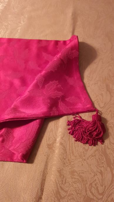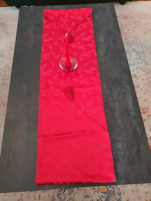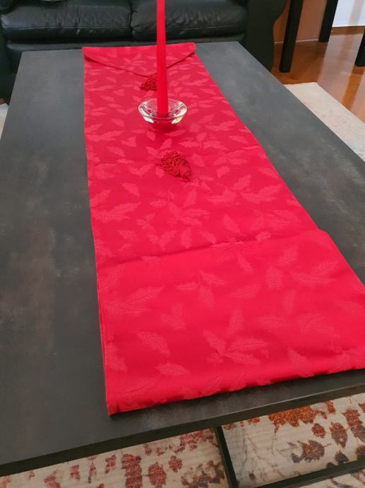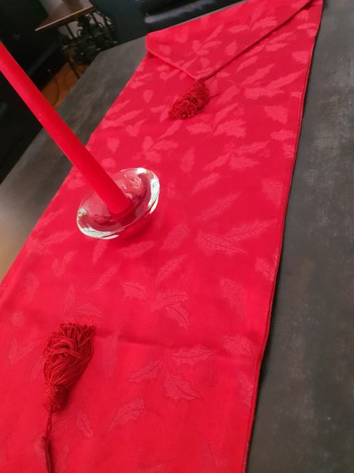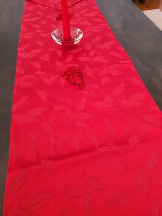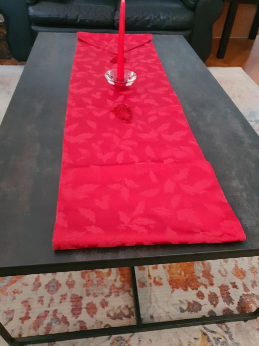 Prodajem novu, ukrasnu traku za stol, crvena, brokat sa decentnim listovima božikovine. Dim.: 174 cm × 34 cm.