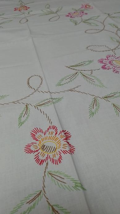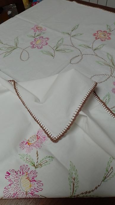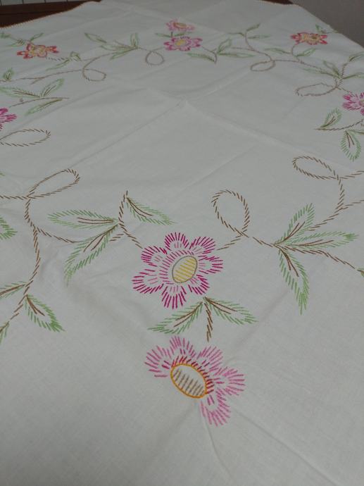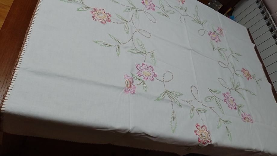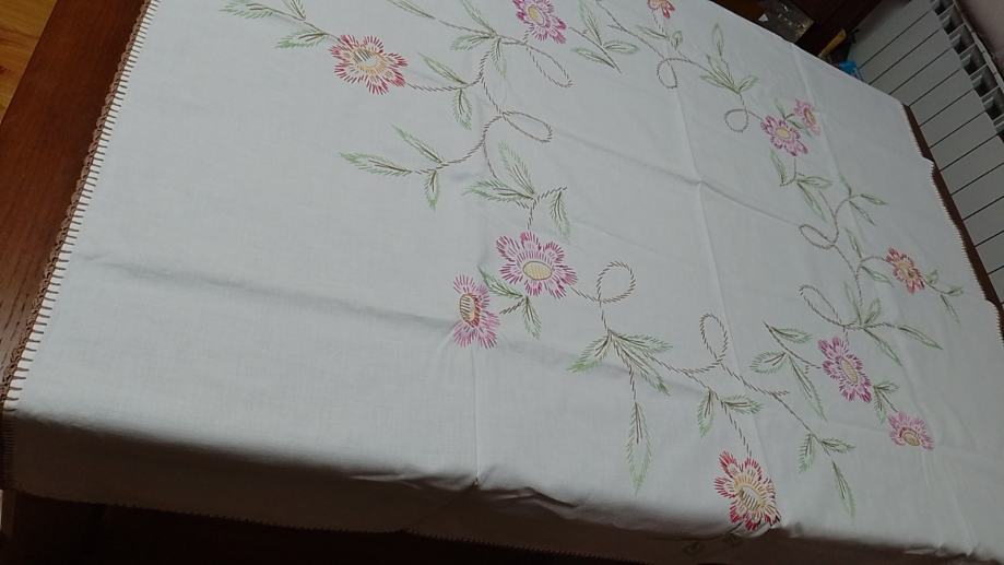 Ne korišten ručni rad na pamučnom platnu,veličina 120x130,rub je rađen direktno na platno,našit i heklan ručno.