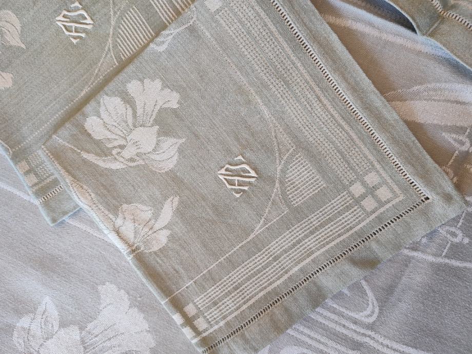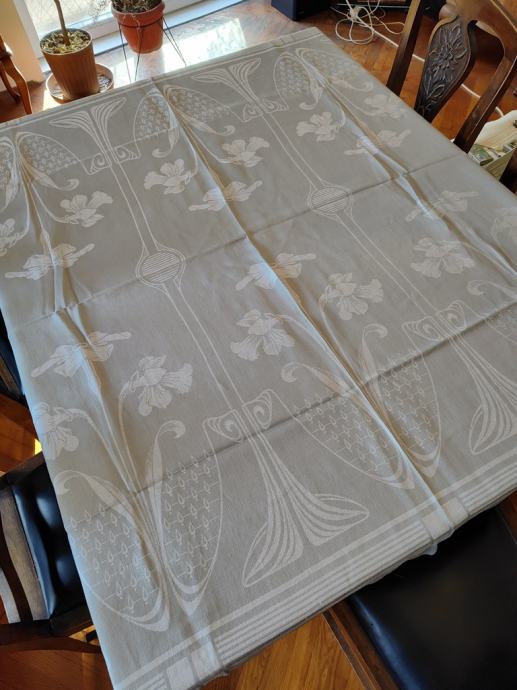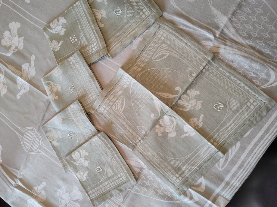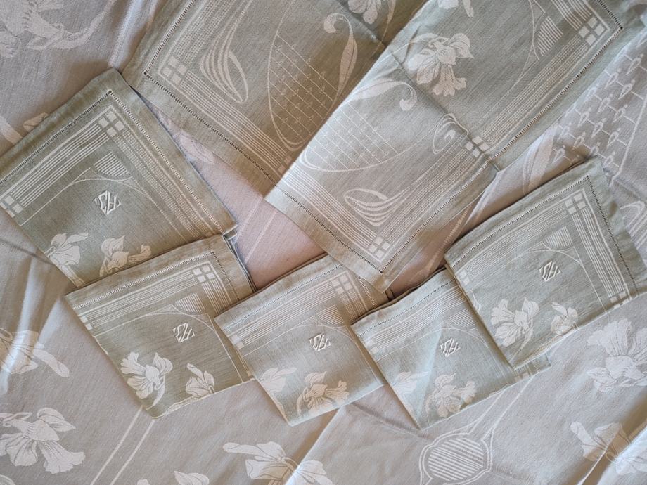 Prodajem lijepi sivi vintage stolnjak sa šest pripadajućih ubrusa od damasta.