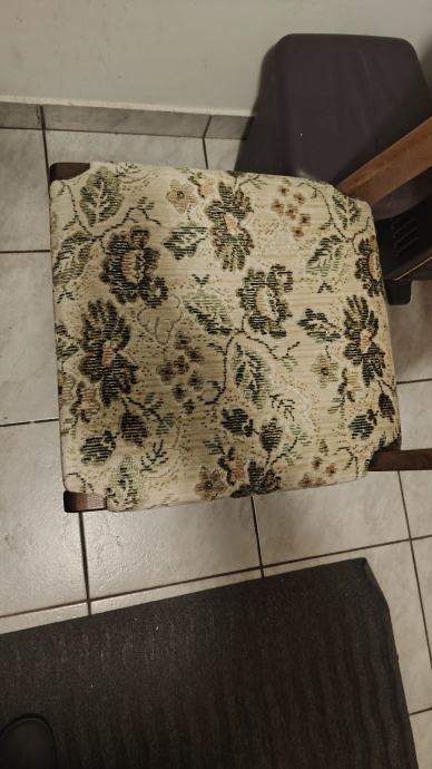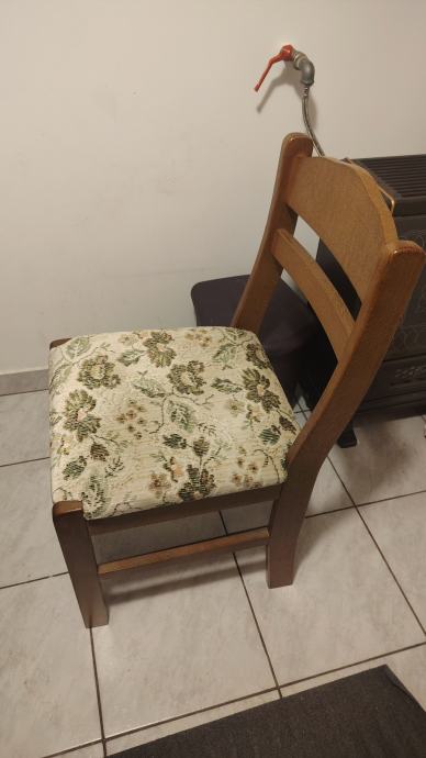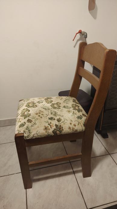 Prodajem 4 drvene stolice s tapaciranim sjedalom. Stolice su masivne konstrukcije od punog drva u prirodnoj boji, s jednostavnim i elegantnim dizajnom. Sjedalo je presvučeno kvalitetnom tkaninom sa cvjetnim uzorkom u zelenim i smeđim tonovima. Leđa stolice imaju horizontalne letve. Stolice su čvrste i stabilne, izvrsno očuvane - kao nove!!!