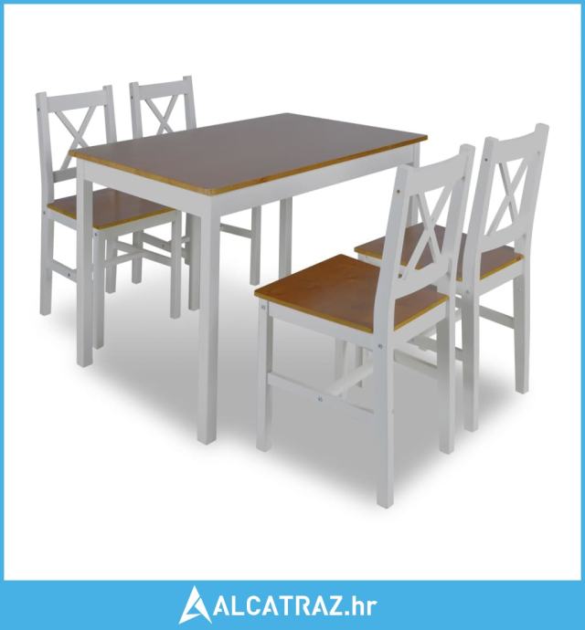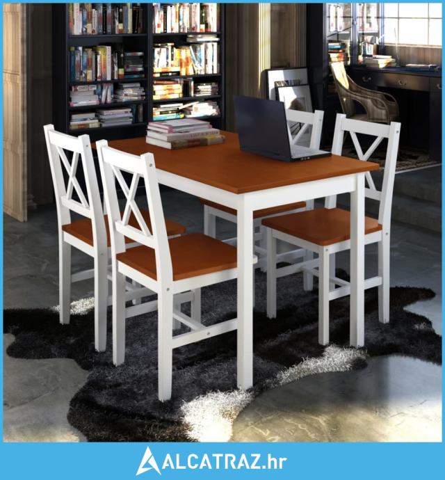 Ovaj blagovaonski set je izrađen od punog drveta s atraktivnom završnicom za prefinjeni izgled koji će vam sigurno služiti puno godina. Isporuka uključuje 4 stolice i stol.