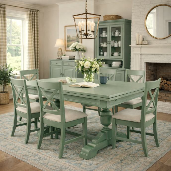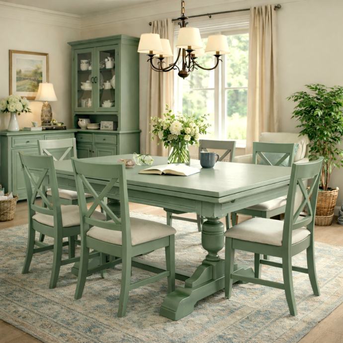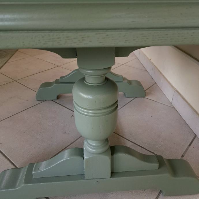 Masivni drveni blagavaonski stol u zeleno sivoj boji poznatijoj kao boja kadulje.