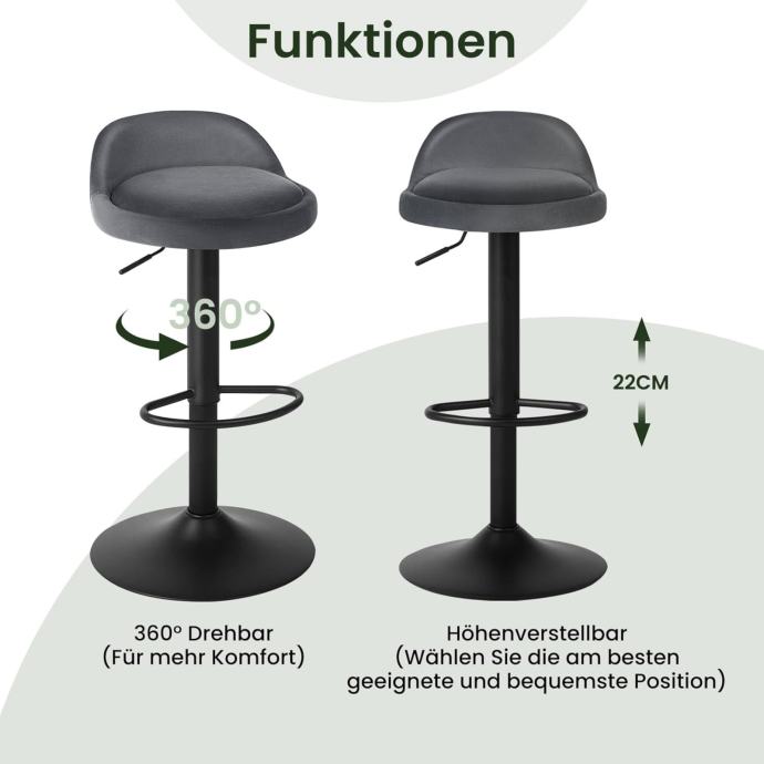 Elegantan izgled za različite scene: klasična boja i elegantan dizajn savršeno kombiniraju vintage i moderni stil. Kombinacija baršunastog sjedala i metalnog okvira u mat crnoj boji odražava visoku kvalitetu. Ova moderna okretna stolica može se koristiti u baru, bistrou, balkonu, šanku za doručak, kuhinjskom otoku, šanku, kućnom baru, restoranu, kafiću, snack baru itd.