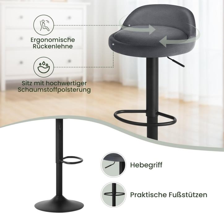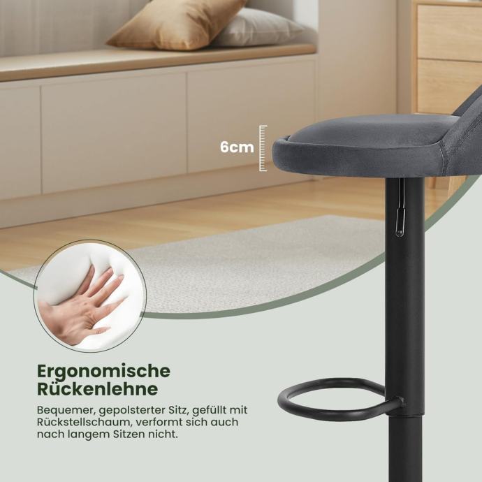 Više udobnosti za vas Barska stolica presvučena baršunom je glatka, sjajna i ne blijedi. Presvučena pjenom visoke gustoće, udobna je, mekana i nije lako deformirati se. Ergonomski niski naslon podupire vaš struk, a oslonac za noge koristi se za opuštanje nogu. Ovaj set od 2 barske stolice dizajniran je kako bi vam pružio udobno i opuštajuće iskustvo sjedenja.