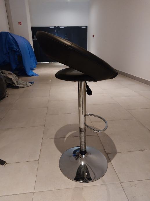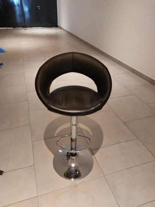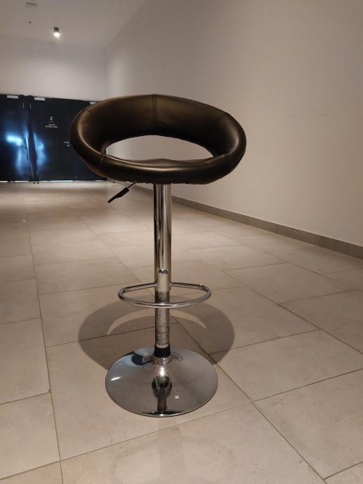 Crna kožna barska stolica s mehanizmom za podizanje. Neoštećena. Visina sjedala u uspravnom položaju je 75 cm.