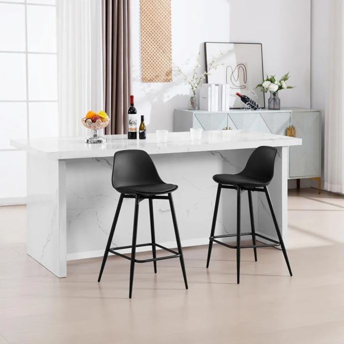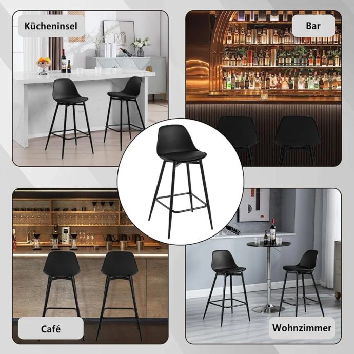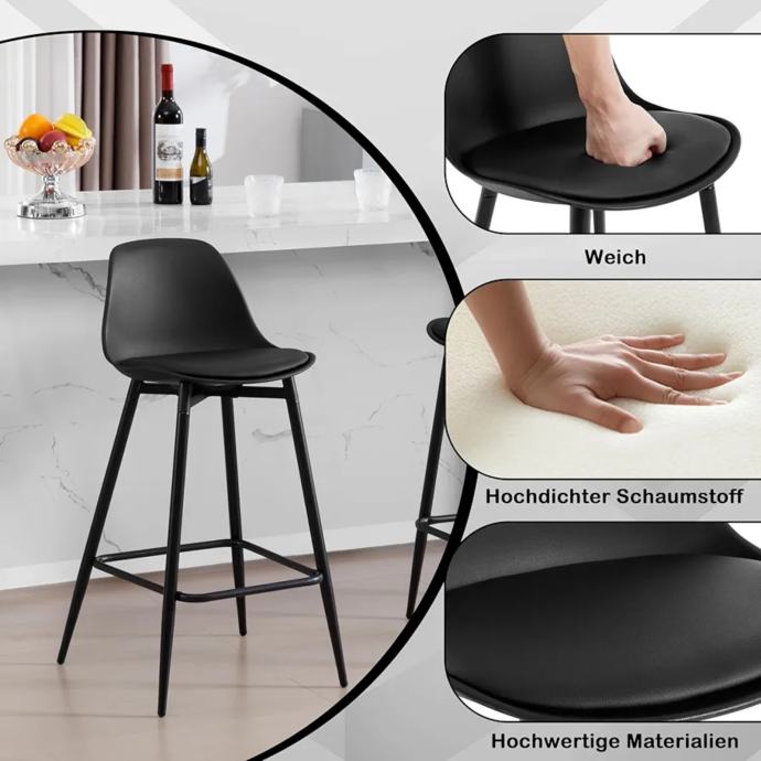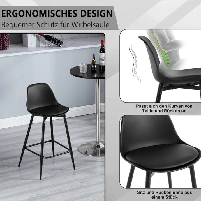 Barske stolice Set od 2 PP kuhinjske stolice s naslonom Visoka stolica s osloncem za noge s metalnim nogama za bar, kuhinju, blagovaonicu, crne boje