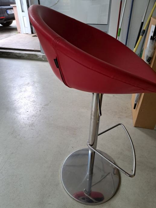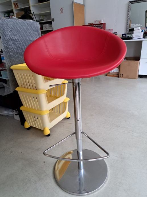 Lijepa, moderna i elegantna, čvrsta barska stolica sa držačem za noge, crvena boja, sjedalo-kvalitetni umjetni materijal (lagan za održavanje), postolje-krom (promjer 40cm); lako podesiva visina: min. 62 cm, max 87 cm, promjer sjedala 53cm/dubina sjedala 48cm, niski naslon.