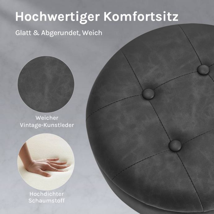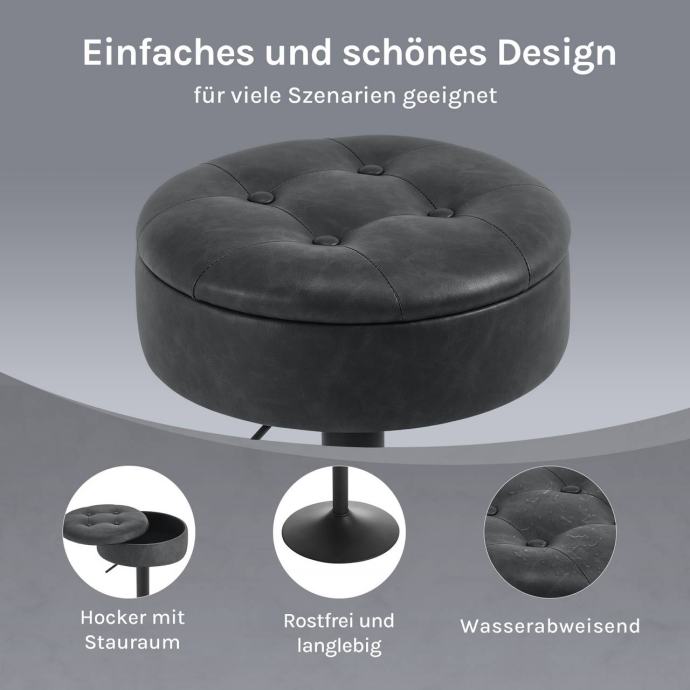 Stolica je čvrsta i dugotrajna zahvaljujući metalnom okviru i širokoj metalnoj podlozi, koja jamči stabilnost i sigurnost, dok protuklizni prsten dodatno štiti pod od ogrebotina. Maksimalno opterećenje stolice je 150 kg. Ova stolica nudi i praktičan prostor za pohranu – uklanjanjem okruglog sjedala otkriva se skriveni prostor u kojem možete držati sitnice poput knjiga, grickalica ili kozmetike i lako ih spremiti nakon uporabe.
