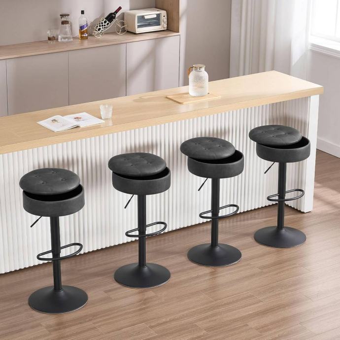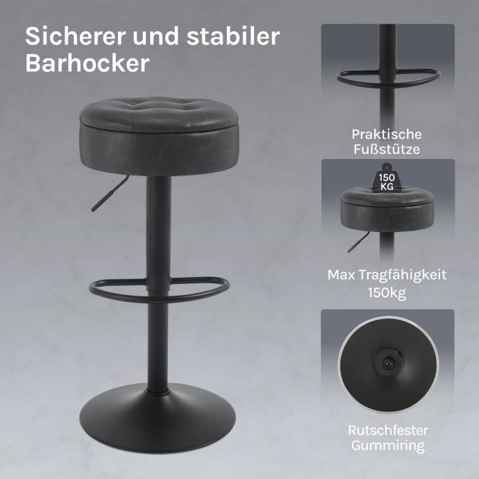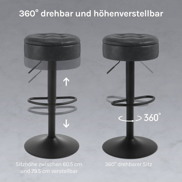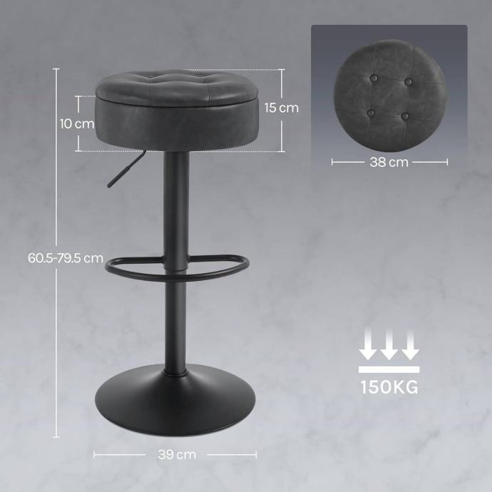 Visina stolice podesiva je od 60,5 do 79,5 cm, a sjedalo se rotira 360° glatko i tiho, što omogućuje jednostavno dosezanje predmeta ili razgovor s prijateljima dok sjedite. Stolica je svestrana i idealna kao barska stolica, stolica za blagovanje, kuhinjska stolica, stolica za toaletni stol ili radni stol. Stolica dolazi s uputama za montažu i priborom, a sastavljanje je jednostavno i brzo. Prije montaže potrebno je ukloniti zaštitni pokrov s plinske opruge.