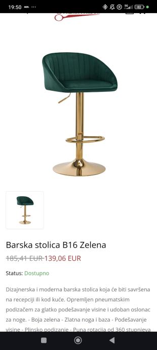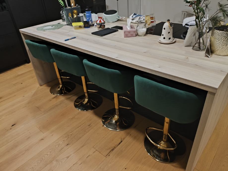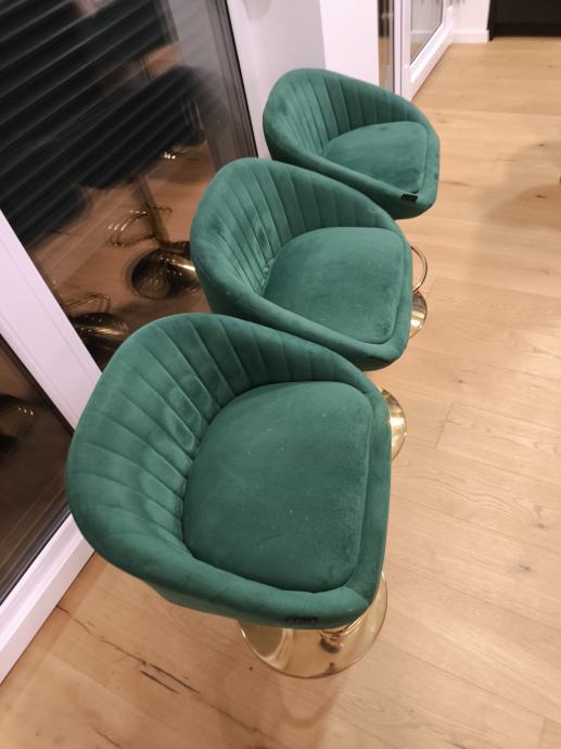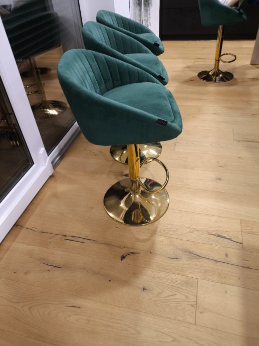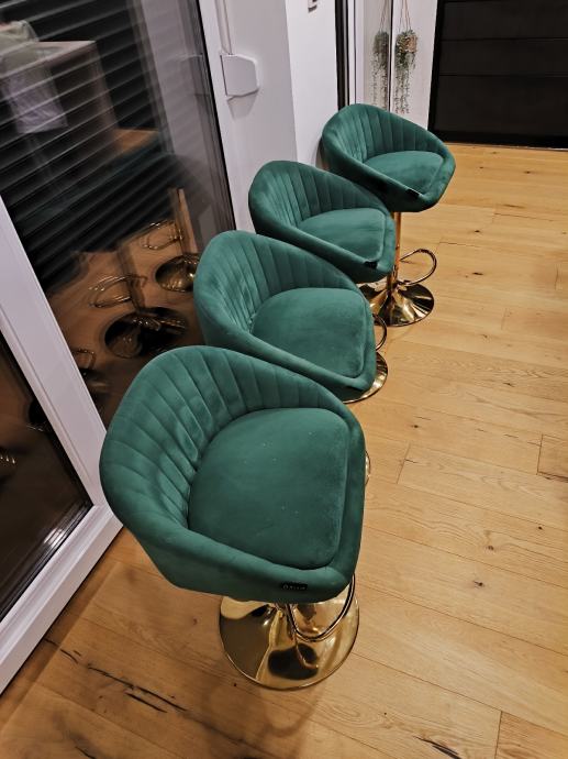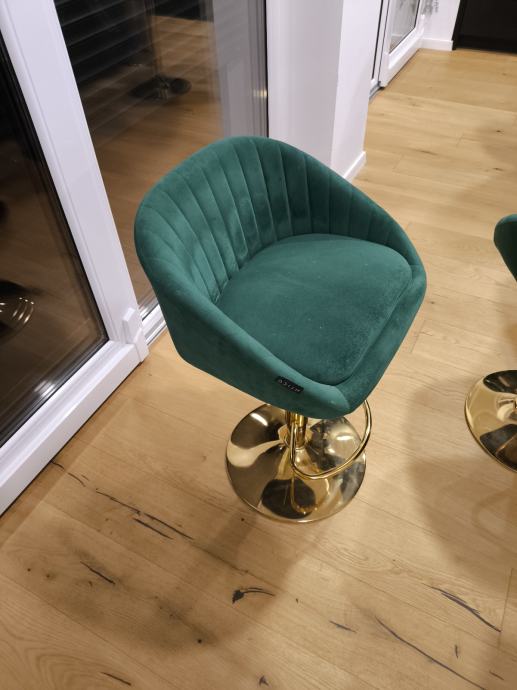 Opremljen pneumatskim podizačem za glatko podešavanje visine i udoban oslonac za noge. - Boja zelena - Zlatna noga i baza - Podešavanje visine - Plinsko podizanje - Puna rotacija od 360 stupnjeva - Udobno sjedalo prekriveno baršunom - Ergonomski oslonac za noge - Okrugla baza s neklizajućom gumom