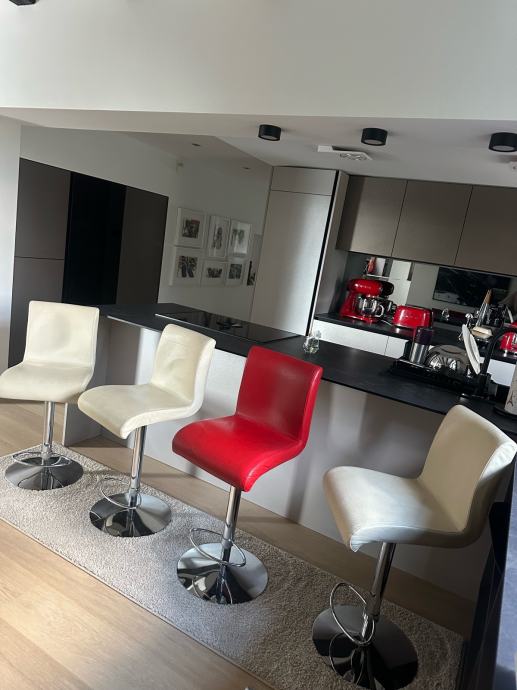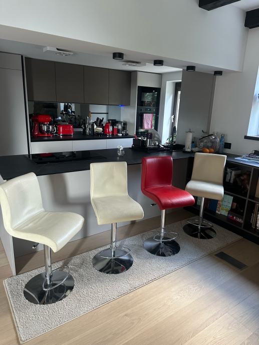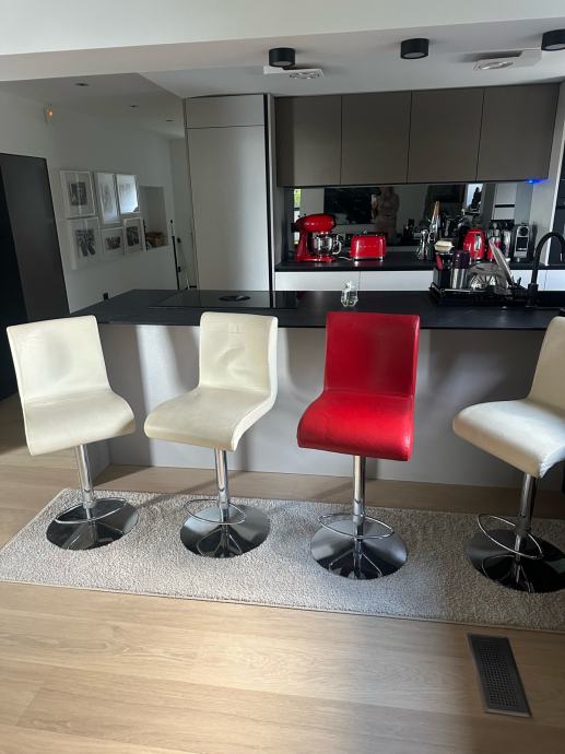 Prodajem 4 kožne barske stolice, 3 bež i jedna crvena, mogucnost podesavanja visine, preugodne za sjedenje.