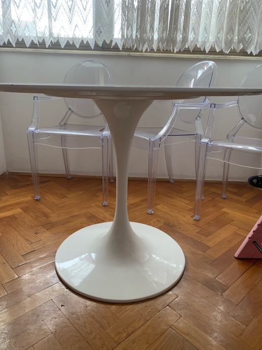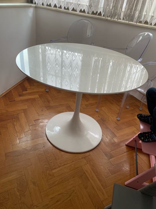 Prodajem bijeli okrugli stol s minimalnim oštećenjima na gornjoj plohi promjera 100 cm i visine 74 cm.