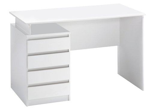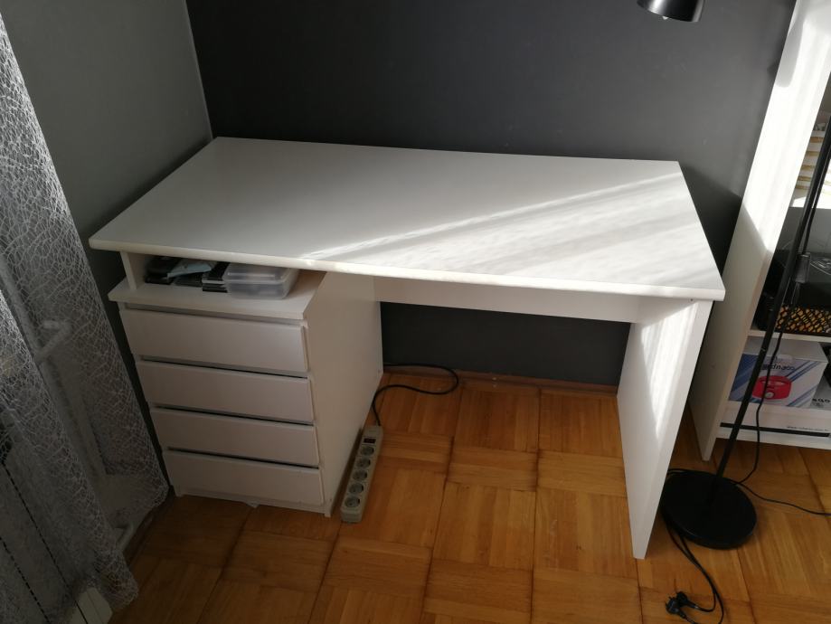 Bijeli radni stol. Prve dvije ladice u funkciji, donje dvije samo za ukras. Korišten nekoliko godina, na gornjoj plohi vidljivi tragovi korištenja. 60x118 visina 75 cm, 43 kg. Melamin + iverica