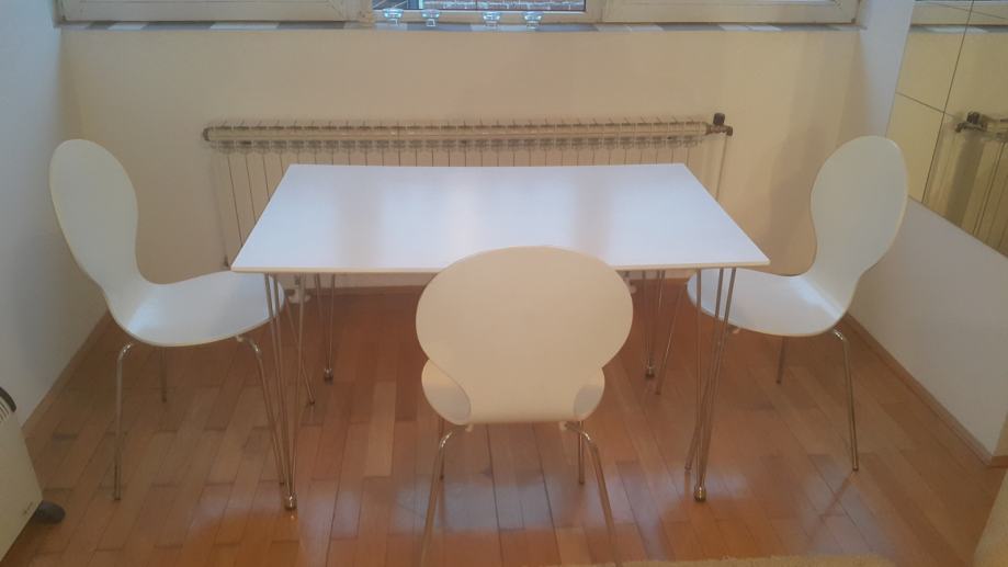 Prodajem bijeli stol s metalnim nogama kupljen u Jysku. Stol je vrlo malo koristen, sastavljen je i ubrzo rastavljen. Dimenzije: sirina 76, duzina 120, visina 73.
