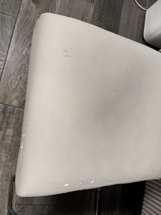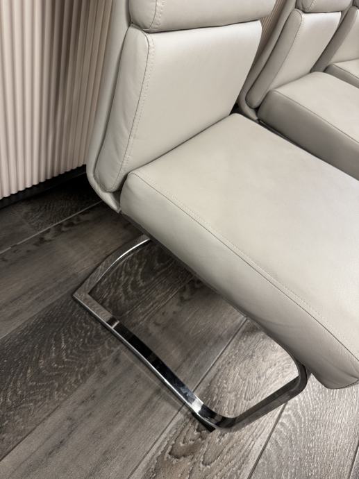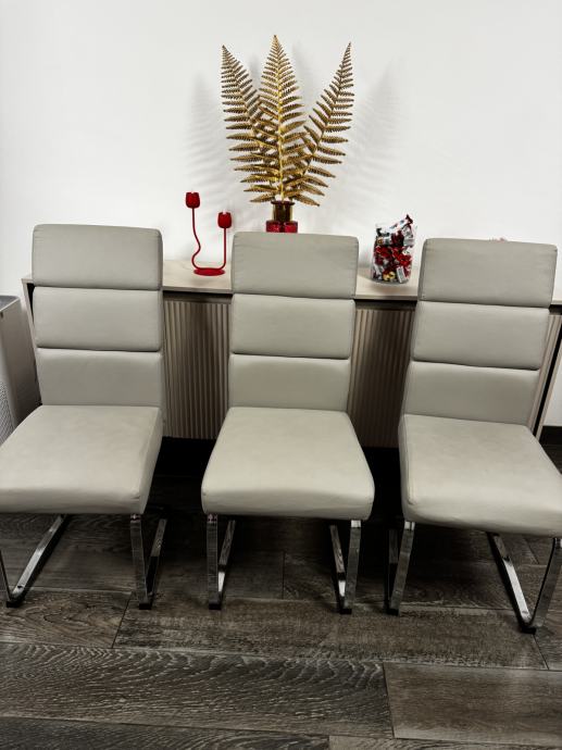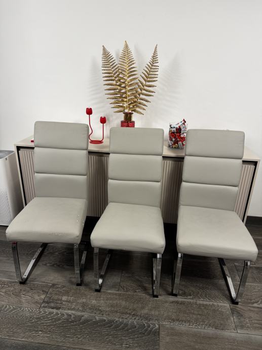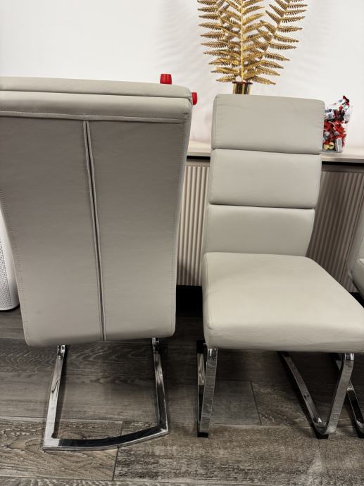 Prodajem 6 modernih stolica, imaju navlaku od umjetne kože u ledeno sivoj boji i postolje od kromiranog metala. 4 stolice su bez oštećenja, a na 2 stolice je oštećenje vidljivo na slikama.