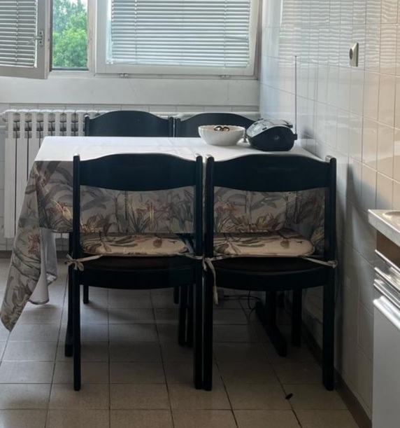Prodajem blagavaonski stol i cetiri stolice, crni, drveni.