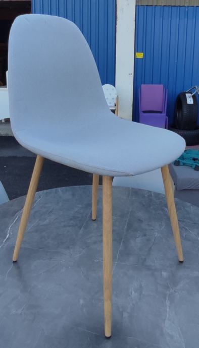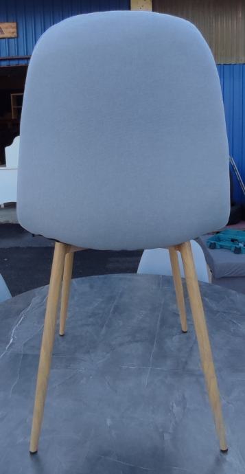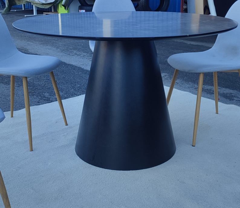 Prodajem blagavaonski set koji se sastoji od okruglog stola promjera 120 cm i 5 stolica. Stol ima moderan dizajn s crnom konusnom nogom i elegantnom okruglom pločom u sivom dekoru s efektom betona. Stolice su tapecirane u svijetlo sivoj boji s metalnim nogama u prirodnom tonu. Set je potpuno nov i nekorišten.
