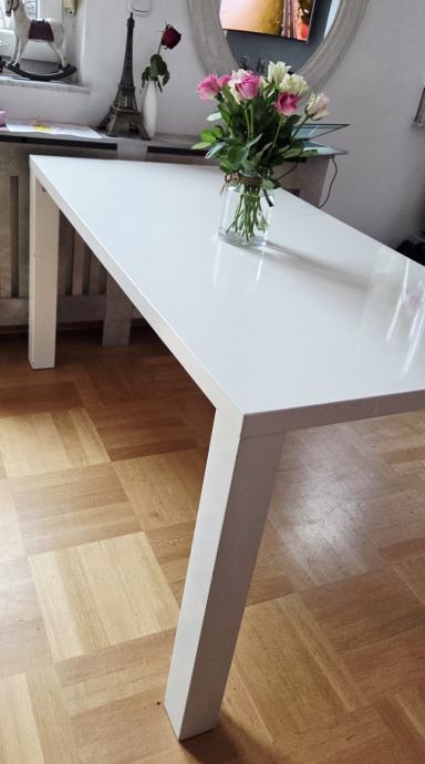 Blagavaonski stol bijele boje, u visokom sjaju, sa manjim ostecenjima vidljivim na slikama. Moguce rastaviti noge prije preuzimanja.