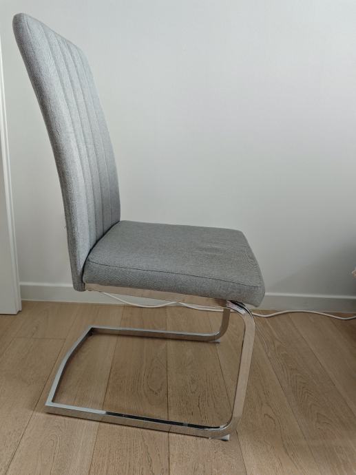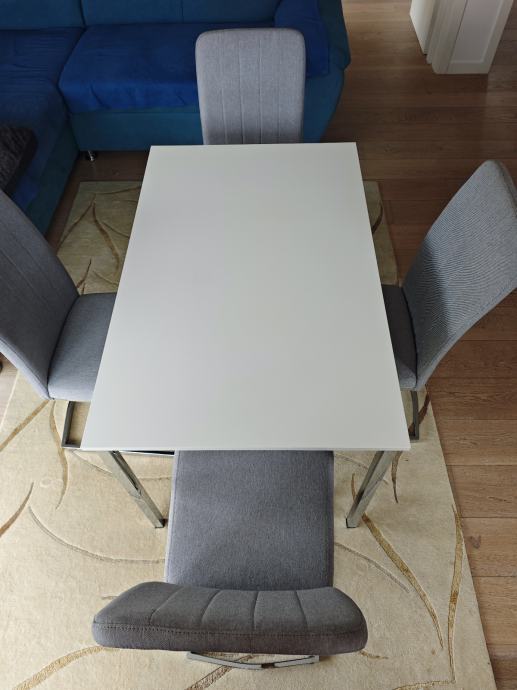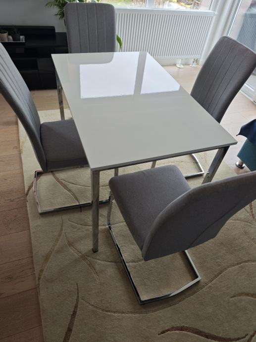 Prodajem blagavaonski stol sa 4 stolice u modernom dizajnu. Stol ima bijelu ploču visokog sjaja sa inox nogama, a stolice su presvučene tamnosivom tkaninom s dekorativnim prošivanjem na leđima. Stolice imaju udobno sjedalo i solidnu konstrukciju sa inox nogama. Set je funkcionalan i prilično kompaktan, prikladan za manje blagovaonice ili kuhinje.