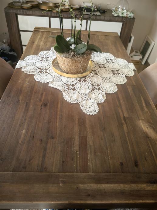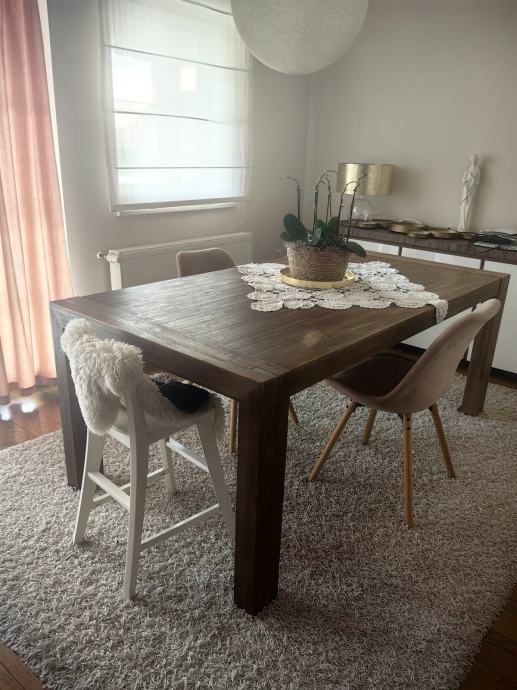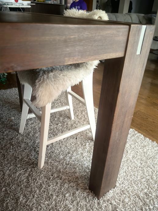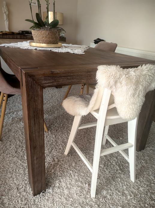 Prodajem rabljeni blagovaonski stol tamnosmeđe boje s drvenom površinom u rustikalnom stilu. Stol je kvadratnog oblika, solidne i masivne izrade, s dovoljno mjesta za više osoba. Dobro se uklapa u različite blagovaonske prostore. Stol je kupljen u Lesnini. Stol prodajem zbor renovacije prostora. Dobro je očuvan, osim na nekoliko mjesta se vide tragovi dječjeg flomastera. Razlog prodaje je jer nam zauzima previše prostora. . Trebalo bi osobno doći po stol.