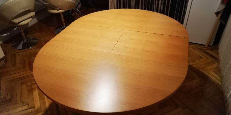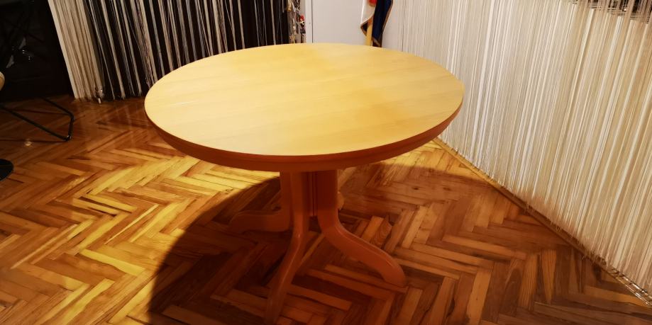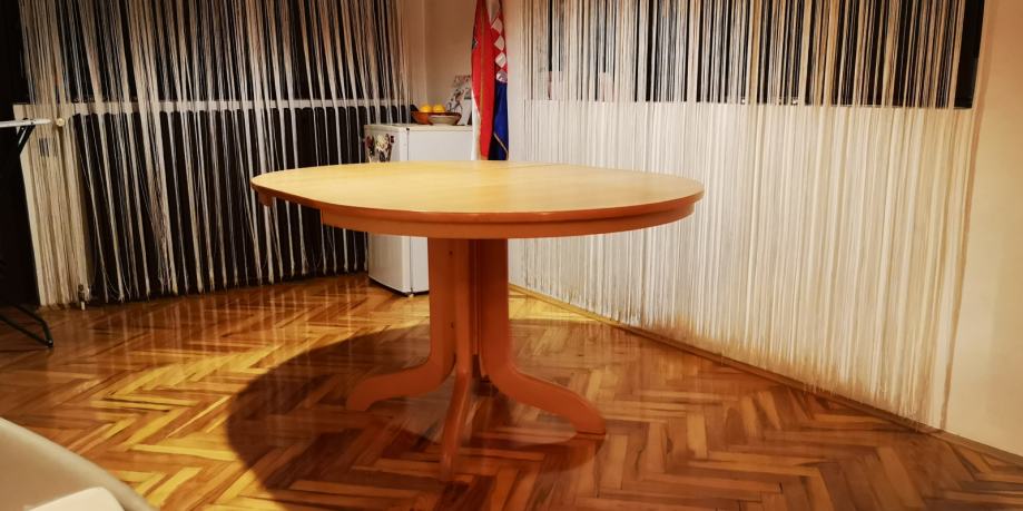 Kvalitetan blagavaonski stol, veći dio puno drvo, promjer 110 cm, proširen 110x150cm