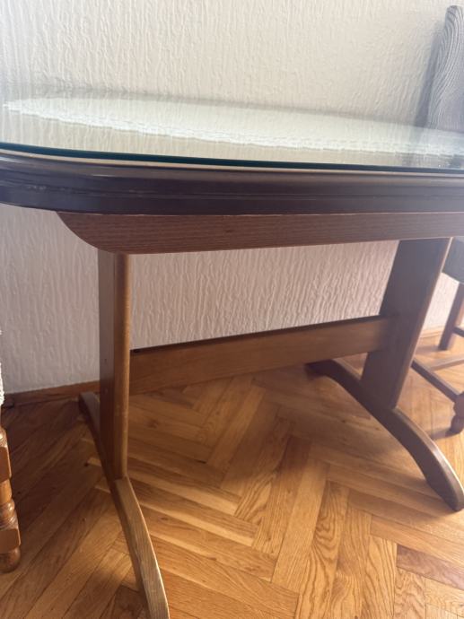 Stol također očuvan, sa staklenom zaštitom, staklo nema oštećenja. Dimenzije 115/75 na razvlačenje. Stol 150€