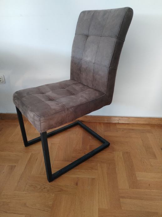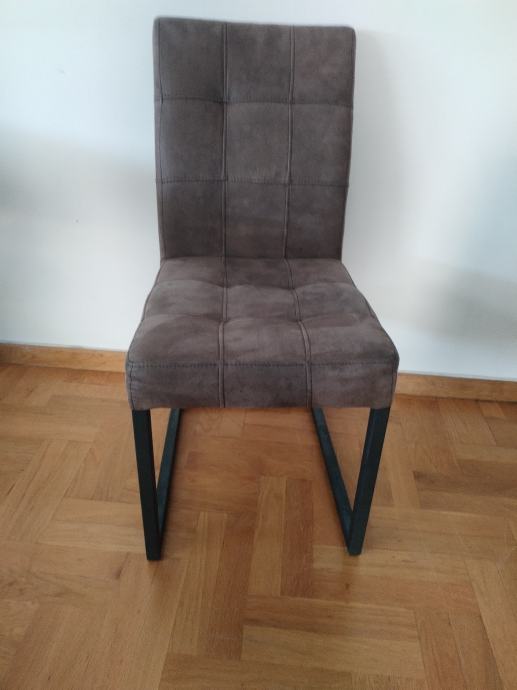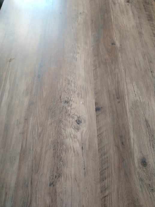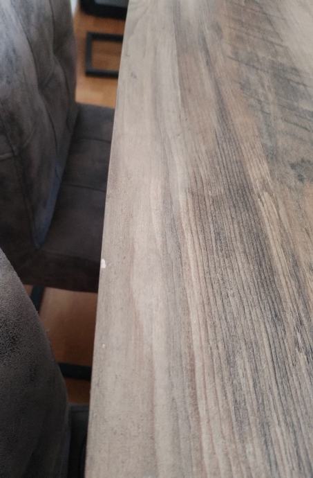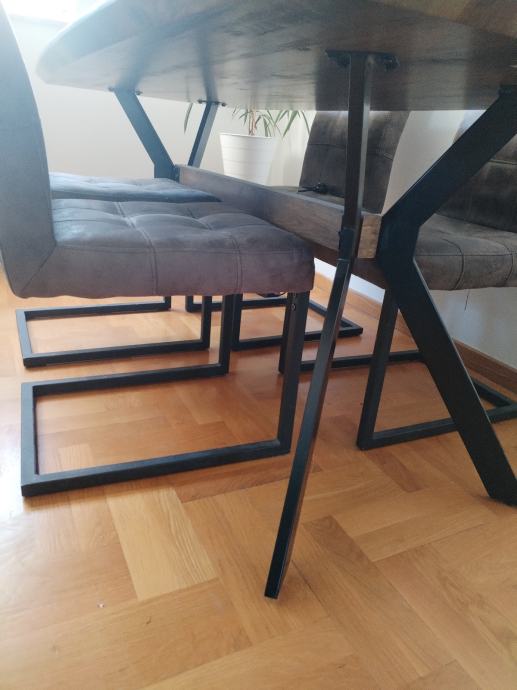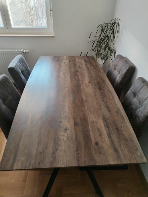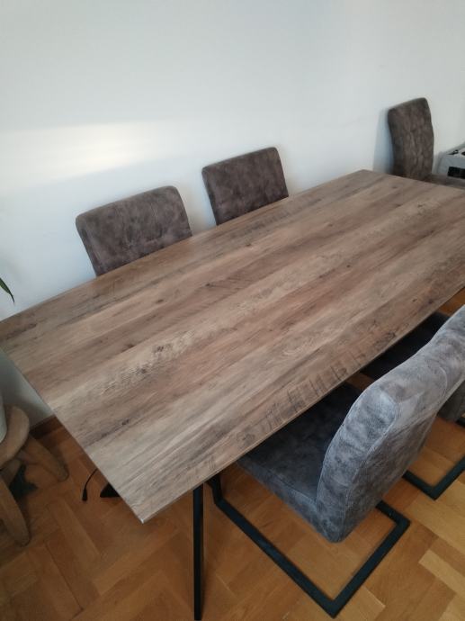 Moderan stol imitacija drva s masivnim metalnim postoljem. Cijena novog stola je bila 450 eur. Dim: 180x90cm. Stolice 6kom.