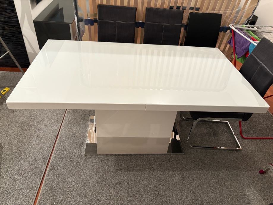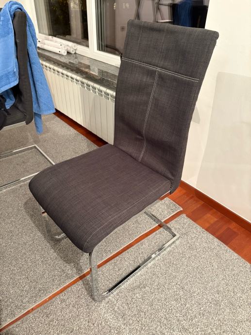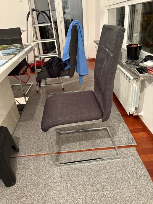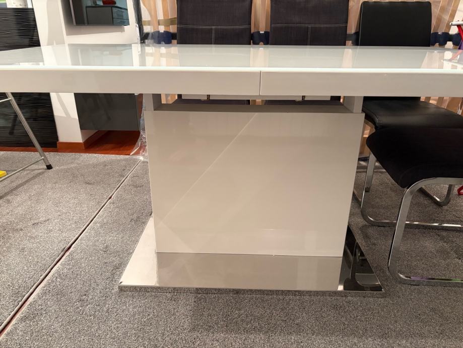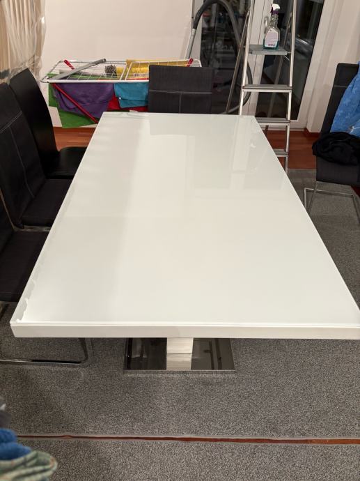 Radi preuređenja stana i promjene stila interijera na prodaju je stol dimenzija 160(+40)cm dužina x 90cm širina x 76cm visina uz kaljeno zaštitno staklo debljine 5mm (mliječna boja). Stol ima mehanizam produženja stola za 40cm što iznosi ukupnu moguću dužinu od 2m. Uz navedeni stol ide 6 sivih stolica. Sve je očuvano i korišteno u prostoru u kojem se nikada nije zapalila cigareta.