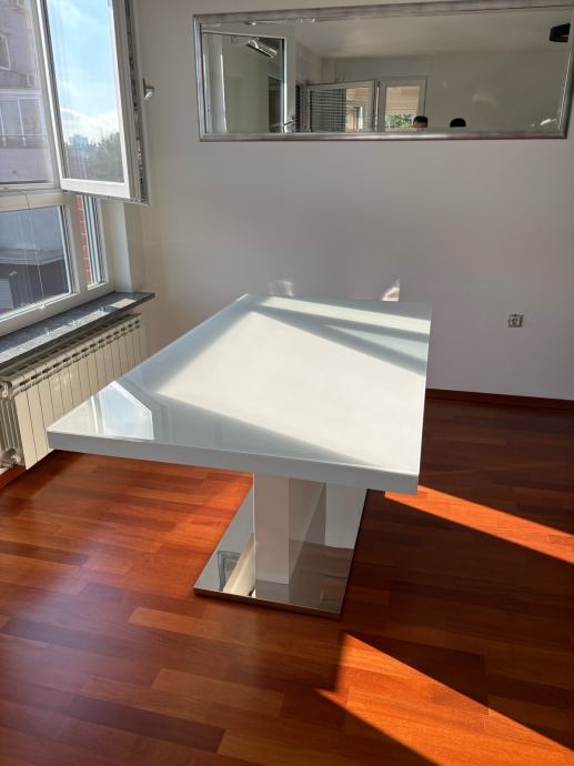 Stol dimenzija 160(+40)cm dužina x 90cm širina x 76cm visina uz kaljeno zaštitno staklo debljine 5mm (mliječna boja). Stol ima mehanizam produženja stola za 40cm što iznosi ukupnu moguću dužinu od 2m.