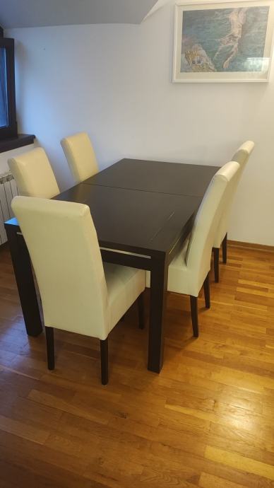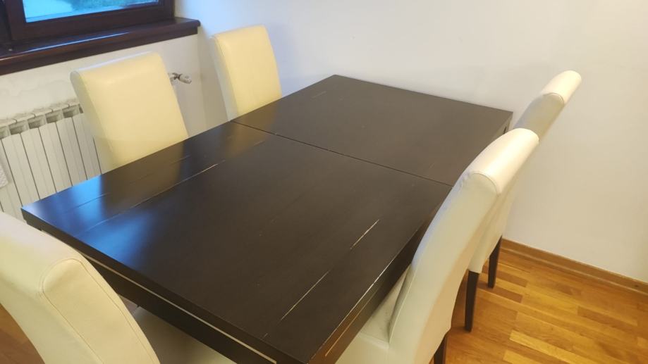 Na stolu su sitna oštećenja (popucalost) koja se može izbrusiti i ponovno izlakirati + rupa u ploči za razvlačenja koja se može zakitati. Ova oštećenja se mogu prekriti stolnjakom.