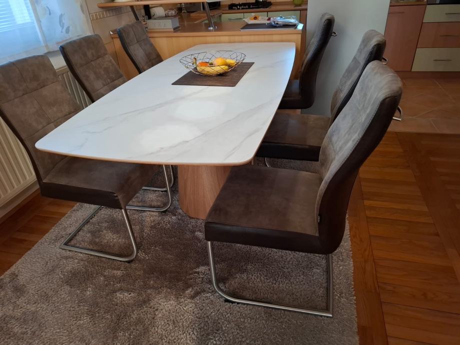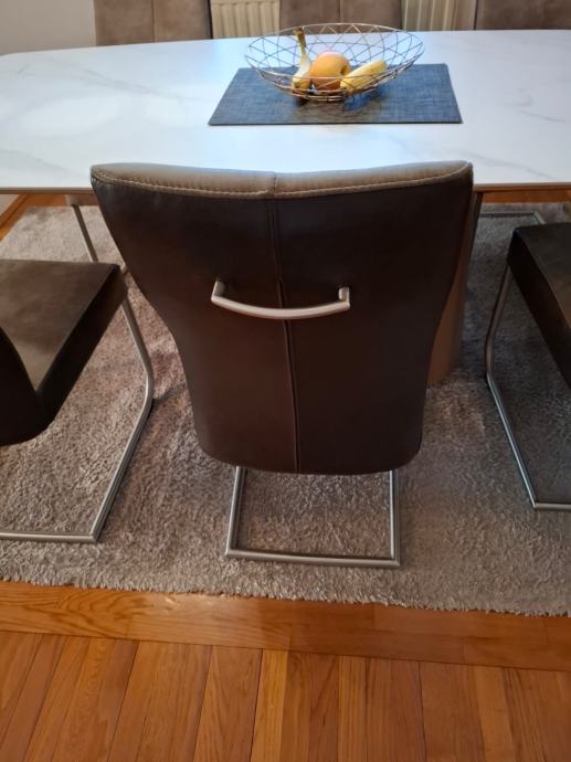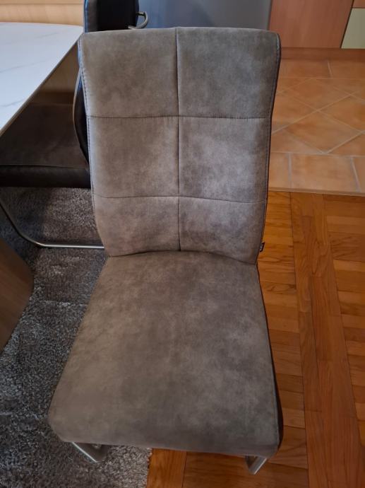 Prodajem 6 blagovaonskih stolica, smeđa boja, u odlicnom stanju, bez ostecenja, minimalni tragovi koristenja, bez mrlja. Kupljene u Lesnini prije 2 godine i tada placene 100€ po komadu.