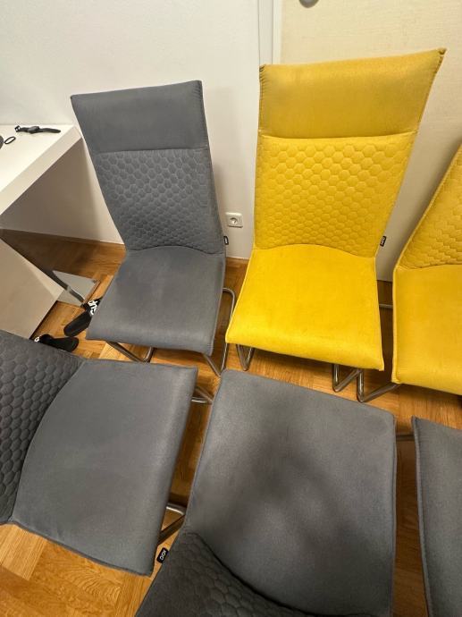 Kao nove,vrlo kratko korištene,kvalitetne,nosivost 140 kg,dimenzije pisu na slici,Zg.Svaka stolica 100 e,4 sive i 2 žute boje senfa,prodaje se iskljucivo svih 6