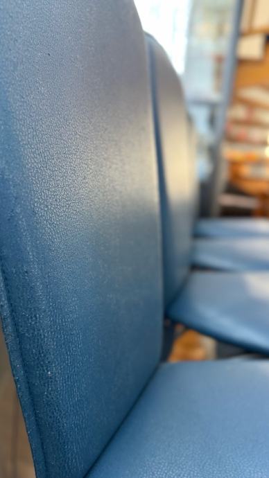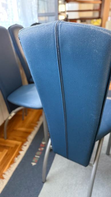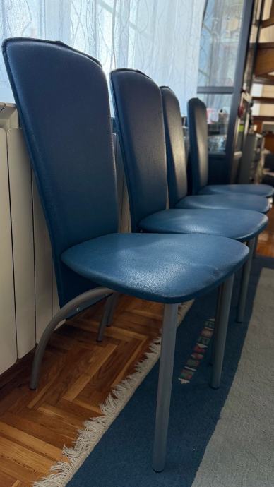 Prodajem 4 blagovaonske stolice s visokim naslonom, presvučene u plavoj eko koži. Noge su metalne, sive boje.