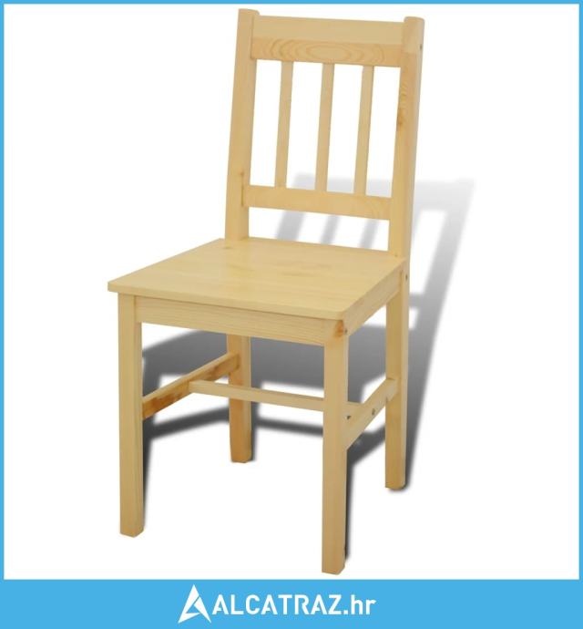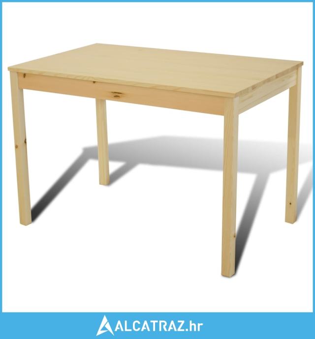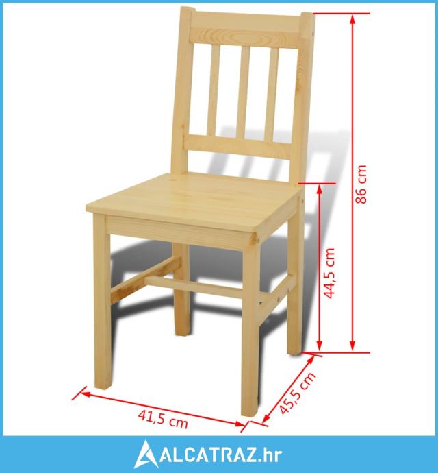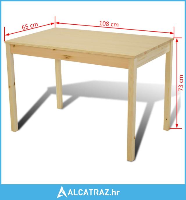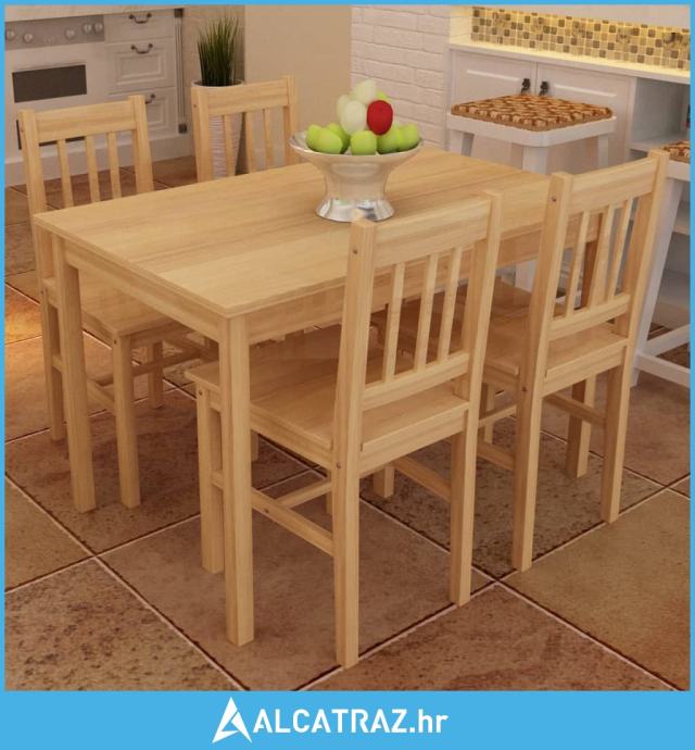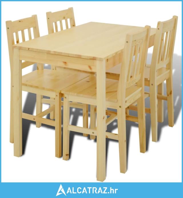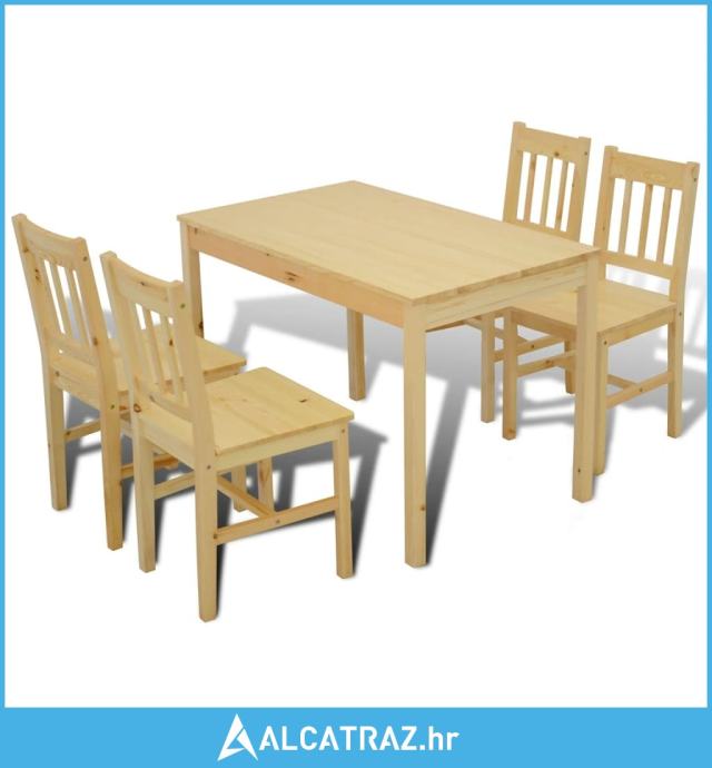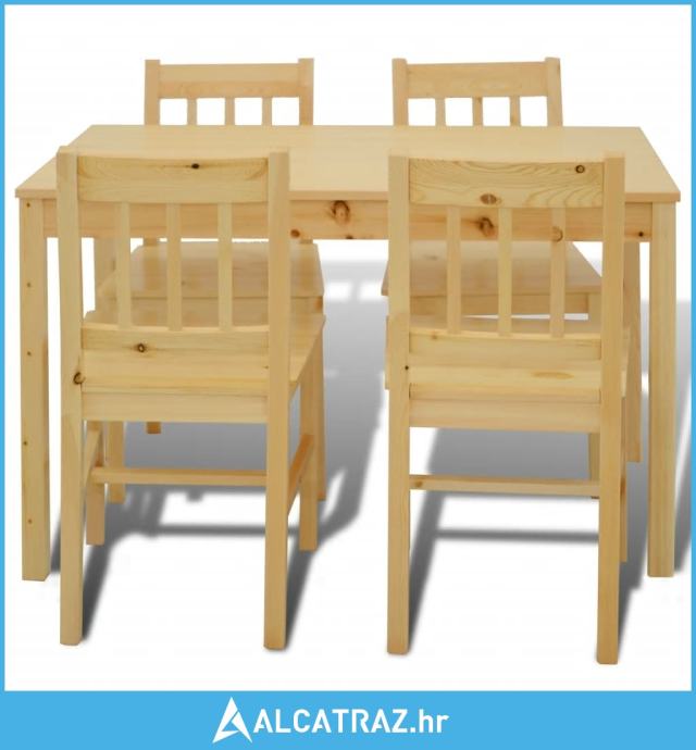 Ovaj set drvenog namještaja uključuje 5 komada, a dizajniran je s čistim i jednostavnim linijama. Ovaj je set savršeni izbor za vašu blagovaonicu ili kuhinju. Posebna elegancija ovog seta će pretvoriti svakodnevnu večeru u posebne večere. Namještaj je izrađen od visokokvalitetnog i čvrstog drveta bora, koji osigurava dodatnu stabilnost, izdržljivost i dugi vijek trajanja. Osim toga, glatka površina namještaja olakšava čišćenje. Također, jednostavno ćete ga montirati. Isporuka uključuje 4 stolice i 1 stol.