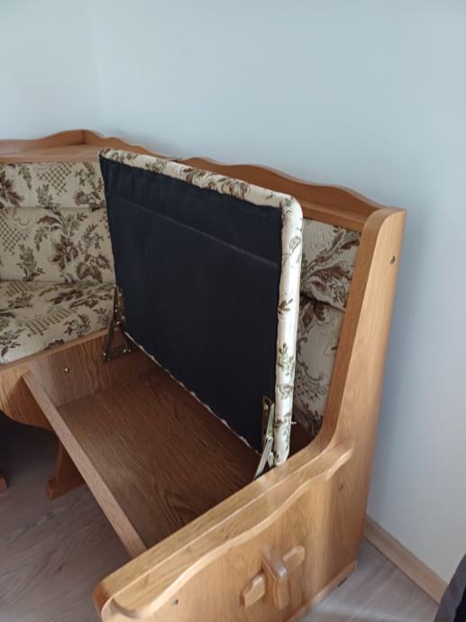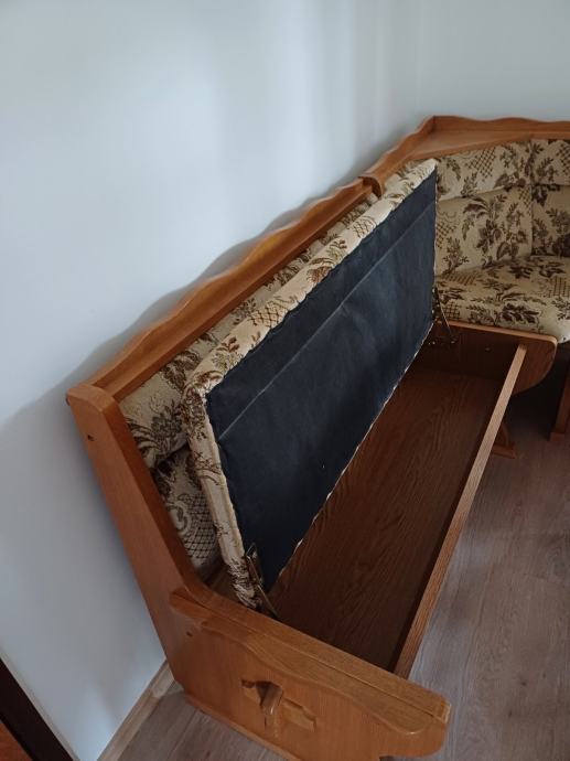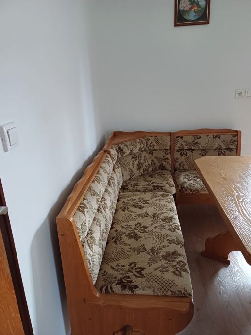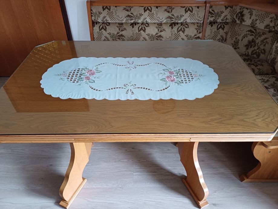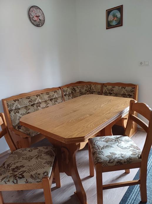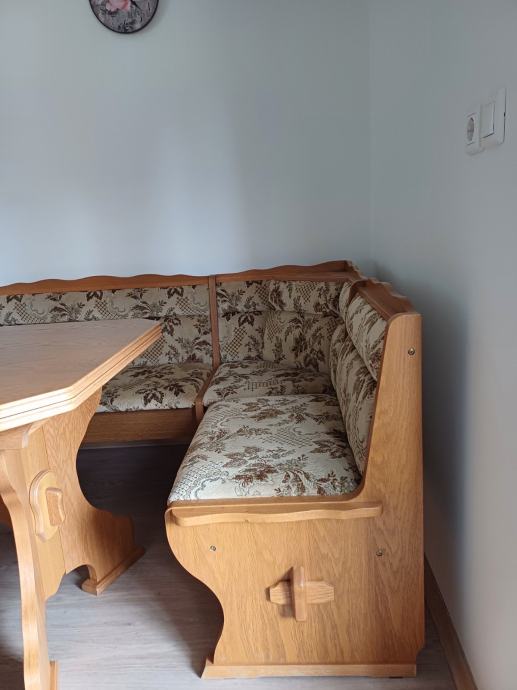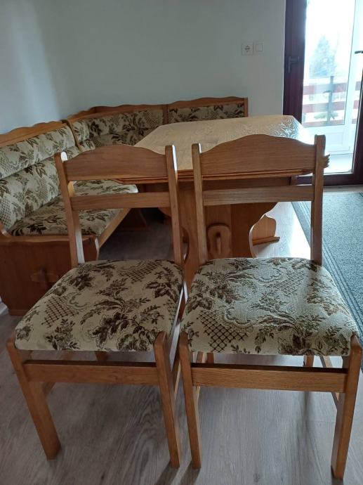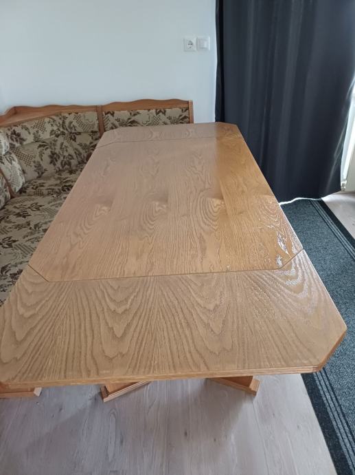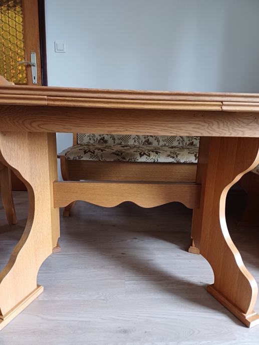 stol na razvlacenje duzina 120 cm (+ 30 cm sa svake strane kad se razvuče), širina 80 cm + staklo, 2 stolice, kutna klupa duža strana 164 cm, kraća strana 124 cm. Može se sastaviti na lijevu, ili desnu stranu.