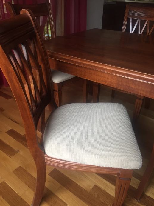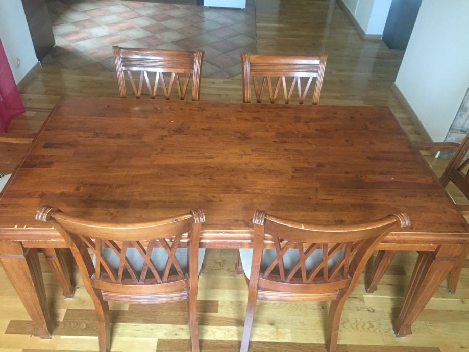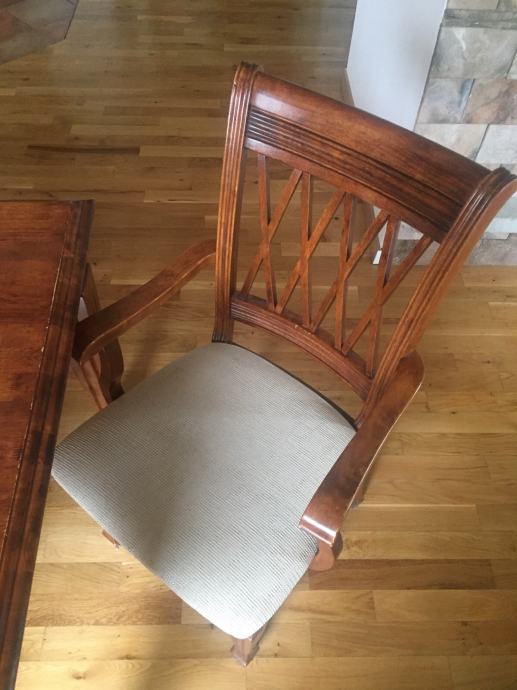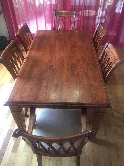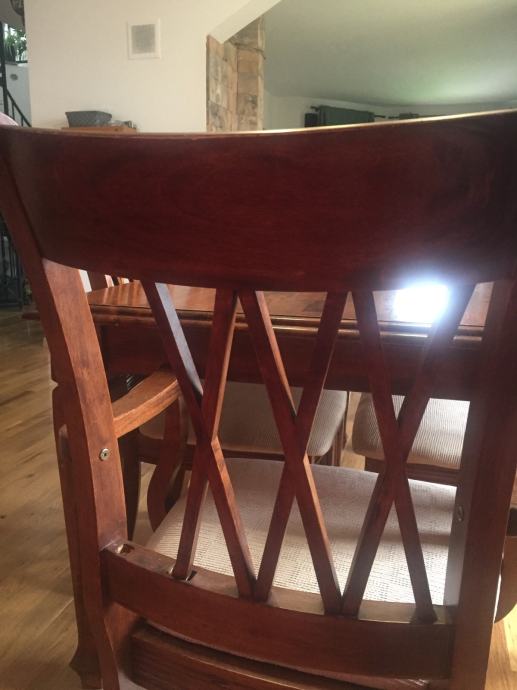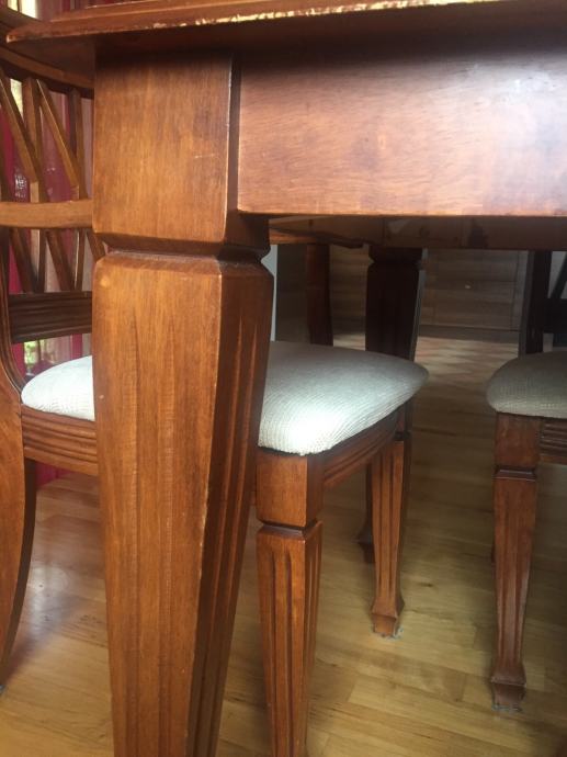 Stol za blagovaonu sa 6 stolica od punog malezijskog drva. Dvije stolice su sa rukonaslonom. Sjedeći dio tapeciran u bež boji.