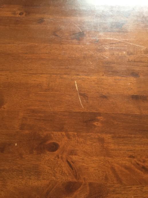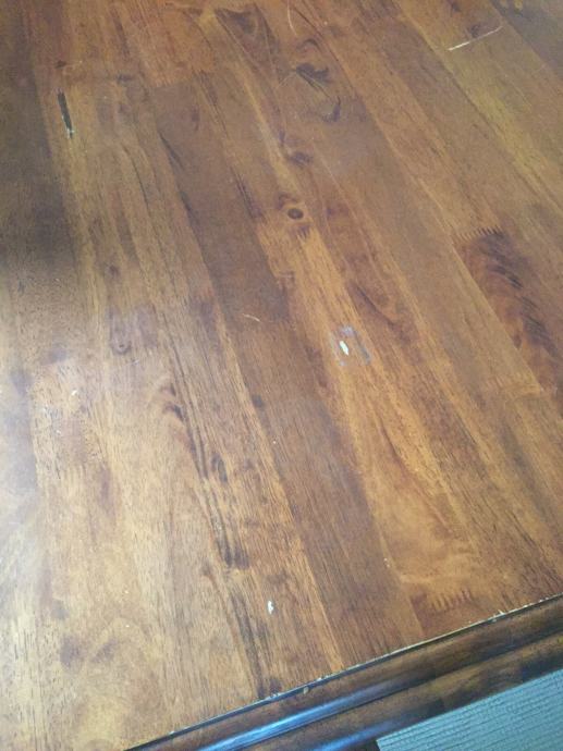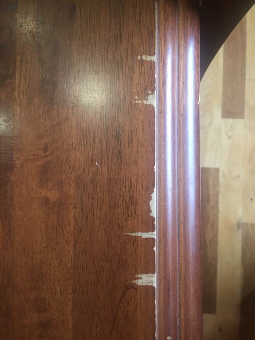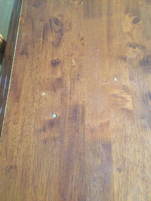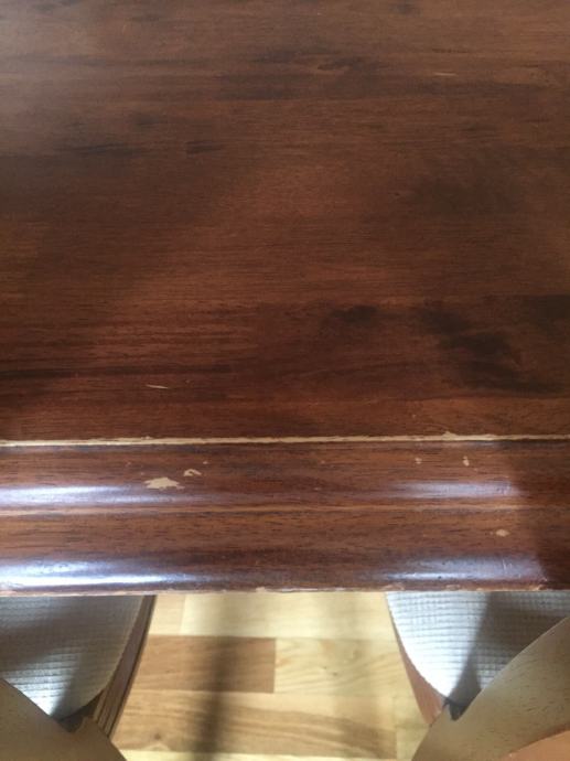 Na jednoj stolici nedostaje dio ukrasa na naslonu. Sitna oštećenja na površini stola su vidljiva na slici.