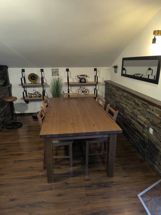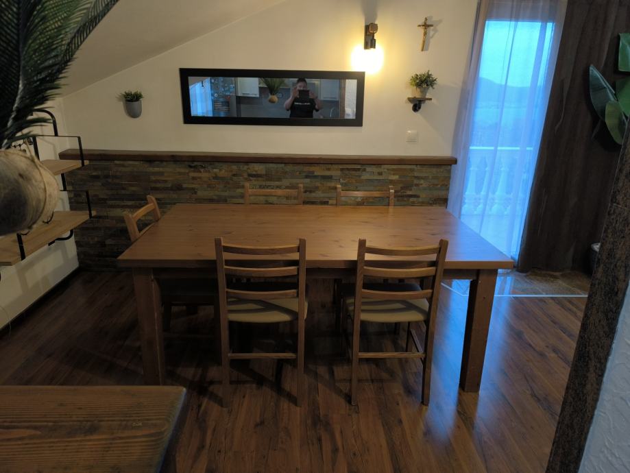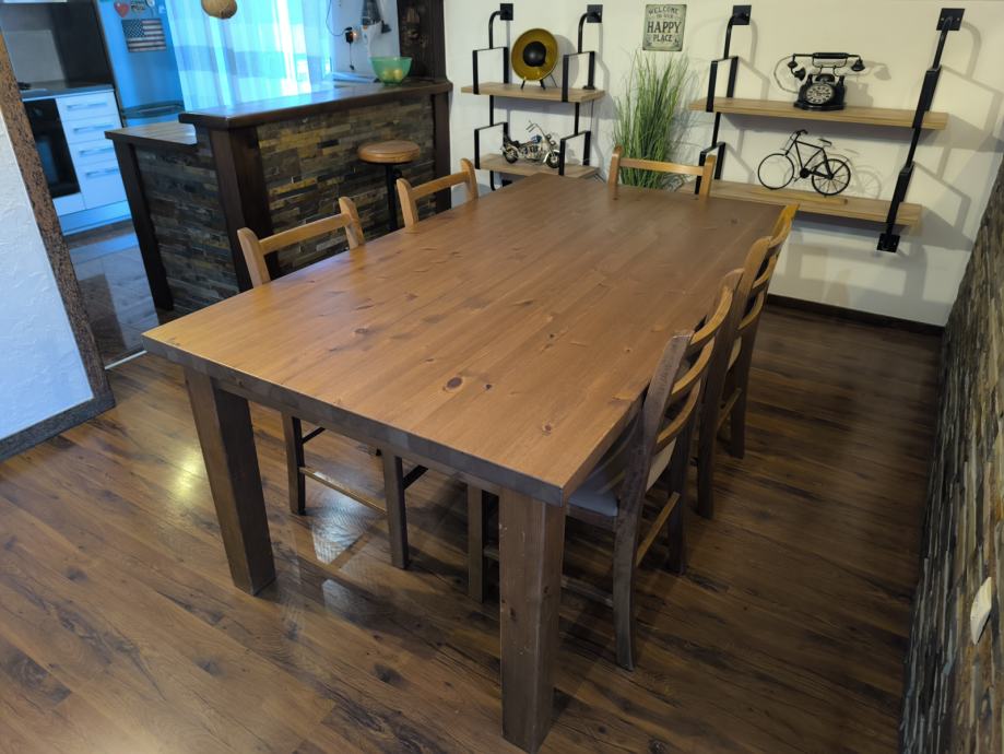 Stol je od punog drva i stolice dimenzije su 180×100. Korišten ali u jako dobrom stanju kao na slici.
