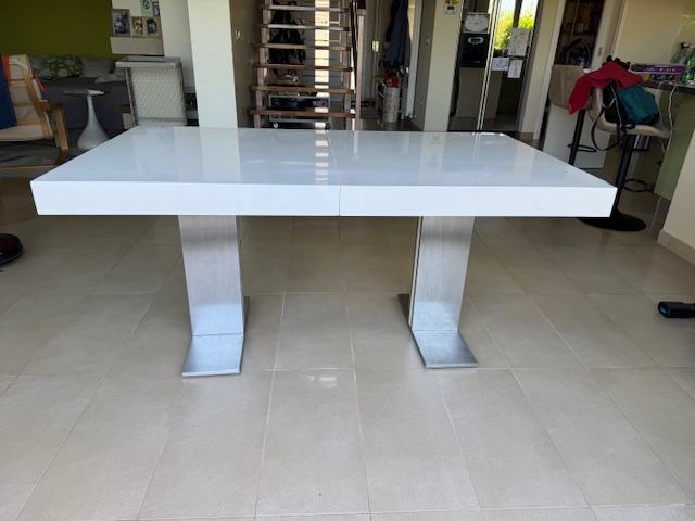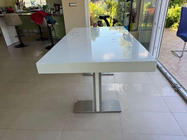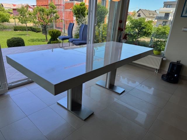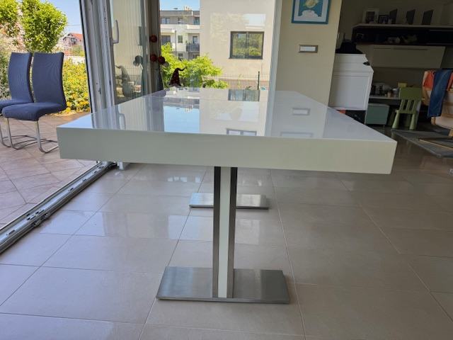 Blagavaonski stol, sjajno bijelo drvo i inox noge. Dimenzije 160 (210 ) x 95 x 75 cm. Stol se može produžiti s nastavkom za 50 cm, sa 160 na 210 cm. Površina stola ima ogrebano područje dimenzija 2 x 0,5cm, vidljivo na slici. Cijena 100 €.
