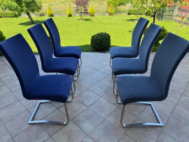 Inox osovina, udobne, dimenzije: širina sjedišta 44 cm, visina sjedišta 46 cm, visina naslona 100 cm. Stolci su izvorno kožni, ali se koža ljušti. Prodajem ih sa platnenim sivim i plavim navlakama. Potrebno ih je pretapicirati ili koristiti s navlakama. Izgled bez navlake vidljiv na zadnjoj slici. Cijena za 6 kom je ukupno 60 €.