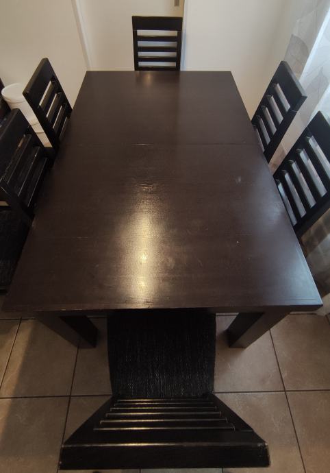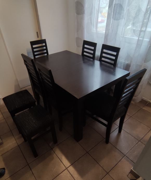 Prodajemo blagovaonski stol na razvlačenje sa 6 stolica i dvije stolice bez naslona, dimenzija 140x90x77cm i dodatak od 60cm