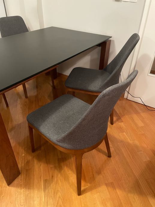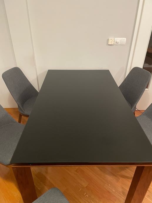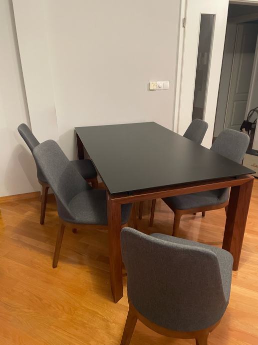 Kvalitetan produživi stol od kaljenog stakla (nije ga moguće ogrebati, potrgati) i punog drva za 6 - 8 osoba, sa 6 sivih tapeciranih i iznimno udobnih stolica (šesta stolica nije na slikama), sve kupljeno u Meblu.