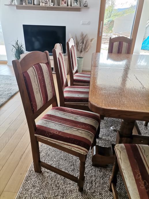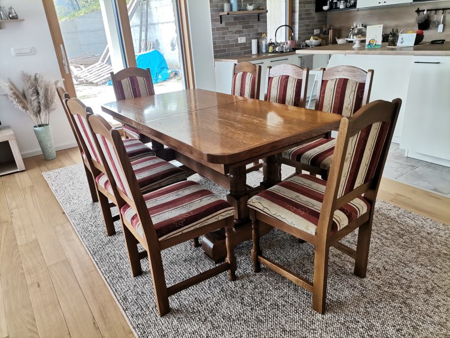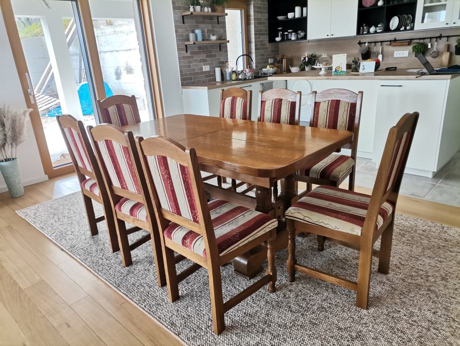 Masivni blagovaonski stol na razvlačenje + stolaca. Domaća proizvodnja (2013. godina), izrađeno od slavonskog hrasta.