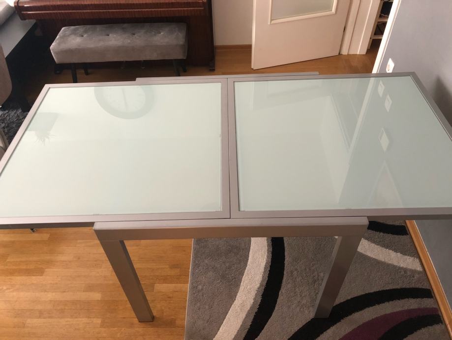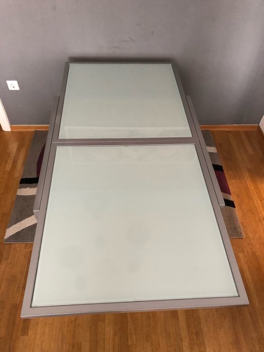 Stol je čvrst, metalni, s površinama za jelo od kaljenog, čvrstog stakla.