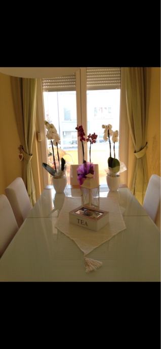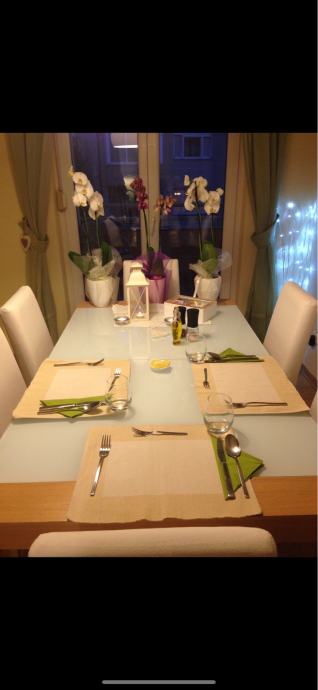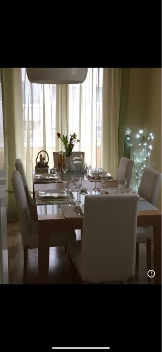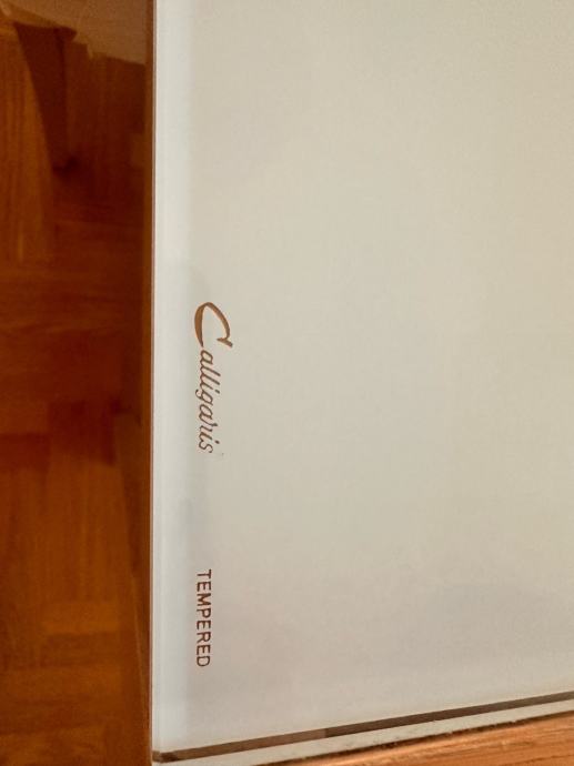 Calligaris suvremeni blagovaonski stol s trešnjinim drvetom, pravokutna ploča od mat stakla u kombinaciji s trešnjom. Stolice Ikea (perive) sve sačuvano. Stol se razvlači, jednostavno u sredini dođe drvena ploča od trešnje drveta, tako da stane 8 do 10 osoba. Visina: 75 cm Duljina/Širina: 160